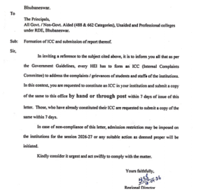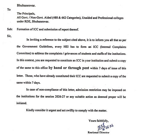 ଭୁବନେଶ୍ୱର, ୧୧/୦୪: ସପ୍ତାହେ ଭିତରେ ସବୁ କଲେଜରେ ଆଭ୍ୟନ୍ତରୀଣ ଅଭିଯୋଗ କମିଟି- ICC ଗଠନ ପାଇଁ ନିର୍ଦ୍ଦେଶ। ଏନେଇ ସବୁ ସରକାରୀ, ବେସରକାରୀ, ଅନୁଦାନପ୍ରାପ୍ତ କଲେଜ ଅଧ୍ୟକ୍ଷଙ୍କୁ...