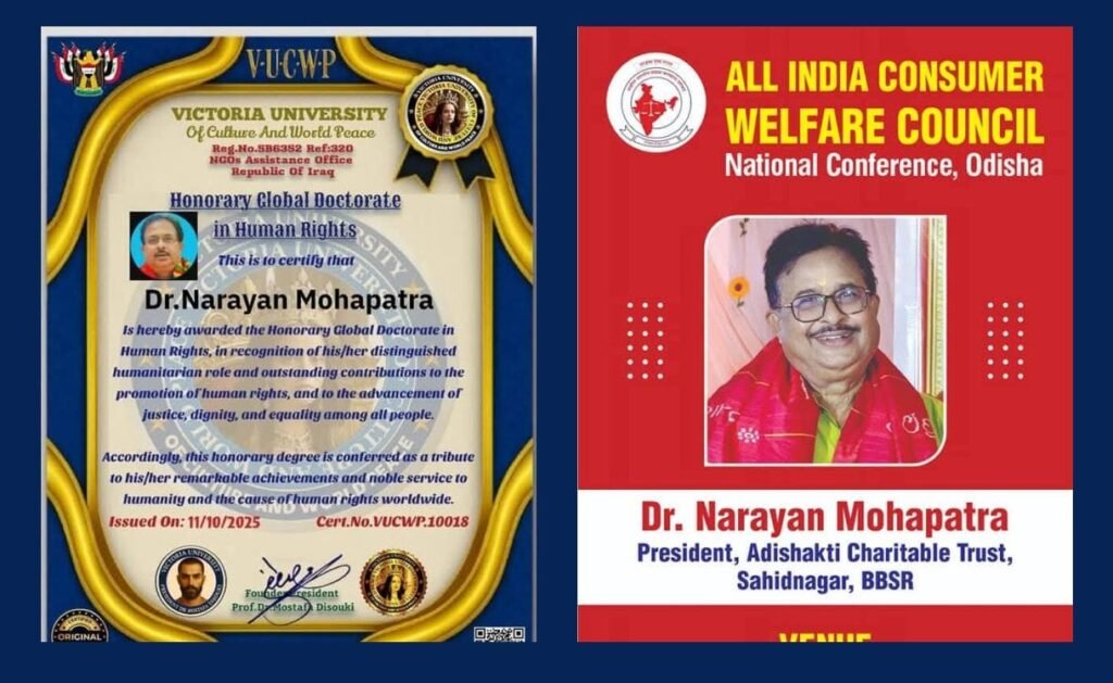 ଆନ୍ତର୍ଜାତୀୟ ଡକ୍ଟରେଟ ଇନ ହ୍ୟୁମାନ ରାଇଟ ଆୱାର୍ଡ ଓ ଅଲ ଇଣ୍ଡିଆ କଞ୍ଜୁମର ୱେଲଫେଆର କାଉନସିଲ ପକ୍ଷରୁ ଭୁନେଶ୍ବରରେ ହେଉଥିବା ଜାତୀୟ ସଭା ରେ ସମ୍ବର୍ଦ୍ଧିତ କରା ଯାଇଛି, ସମାଜ ସେବାରେ ନିଜକୁ ନିୟୋଜିତ କରି ଥିବା ଡ଼ ମହାପାତ୍ର ଅ ବହେଳିତ ବରିଷ୍ଠ ନାଗରିକ ଓ ଅବହେଳିତ ଛୋଟ ପିଲାମାନଙ୍କ ମାଗଣା ସ୍ୱାସ୍ଥ୍ୟ ପରୀକ୍ଷା ଦୀର୍ଘ ଦିନରୁ କରି ଆସୁଛନ୍ତି,ସେମାନ ଙ୍କ ସାଙ୍ଗେ କିଛି ସମୟ ରହି ସେମାନଙ୍କୁ ଖୁସି ଦେବା ମୂଳ ଲକ୍ଷ୍ୟ, ରକ୍ତଦାନ କାର୍ଯ୍ୟକ୍ରମ ଓ ଅବହେଳିତ ବରିଷ୍ଠ ନାଗରିକ ମାନଙ୍କ ପାଇଁ ସମୟ ଦାନ କରି ଉଲ୍ଲେଖ ନିୟ କାର୍ଯ୍ୟ କରି ଅଛନ୍ତି, ପୂର୍ବରୁ ମଧ୍ୟ ରାଜ୍ୟ, ଦେଶ ଓ ଦେଶ ବାହାରୁ ମାନବ ମଙ୍ଗଳ କାର୍ଯ୍ୟ ନିମନ୍ତେ ବିଭିନ୍ନ ଅନୁଷ୍ଠାନ ପକ୍ଷରୁ ଡ଼ ମହାପାତ୍ର ଙ୍କୁ ସମ୍ବର୍ଦ୍ଧିତ କରାଯାଇଛି, ଆମକୁ ସମାଜ ସେବା ପାଇଁ ଉପଯୁକ୍ତ ଭାବି ସମ୍ବର୍ଦ୍ଧିତ କରି ଥିବାରୁ ଆମେ ଦୁଇ ଅନୁଷ୍ଠାନ ର ପ୍ରତିଷ୍ଠାତା ଓ ଅନ୍ୟାନ୍ୟ ପ୍ରମୁଖ ସଦସ୍ୟ ଓ ସଦସ୍ୟା ମାନଙ୍କୁ ହୃଦୟ ରୁ କୃତଜ୍ଞତା ଜ୍ଞାପନ କରୁଛୁ ,ଏହୀ ସମ୍ମାନ ଆମର କରାଯାଉଥିବା ସେବା କାର୍ଯ୍ୟ କୁ ବହୁତ ଉଶ୍ଚାହ ଯୋଗାଇବ ଡ ନାରାୟଣ ମହାପାତ୍ର l
