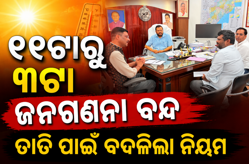 ରାଜ୍ୟରେ ଜାରି ରହିଥିବା ପ୍ରଥମ ପର୍ଯ୍ୟାୟ ଜନଗଣନା କାର୍ଯ୍ୟକୁ ନେଇ ଆସିଛି ଏକ ବଡ଼ ଖବର l ପ୍ରଚଣ୍ଡ ଖରା ଓ ତାତିକୁ ଦୃଷ୍ଟିରେ ରଖି ରାଜ୍ୟ ସରକାର ଗଣନାକାରୀଙ୍କ ପାଇଁ କଡ଼ା ନିର୍ଦ୍ଦେଶନାମା ଜାରି କରିଛନ୍ତି lଲୋକସେବା ଭବନଠାରେ ରାଜସ୍ୱ ଓ ବିପର୍ଯ୍ୟୟ ପରିଚାଳନା ମନ୍ତ୍ରୀ ଶ୍ରୀ ସୁରେଶ ପୂଜାରୀଙ୍କ ଅଧ୍ୟକ୍ଷତାରେ ଅନୁଷ୍ଠିତ ଏକ ସମୀକ୍ଷା ବୈଠକରେ ଏହି ନିଷ୍ପତ୍ତି ନିଆଯାଇଛି l ମନ୍ତ୍ରୀଙ୍କ ନିର୍ଦ୍ଦେଶ ଅନୁସାରେ, ଏଣିକି ଦିନ ୧୧ଟାରୁ ଅପରାହ୍ନ ୩ଟା ପର୍ଯ୍ୟନ୍ତ ଜନଗଣନା କାର୍ଯ୍ୟ ସ୍ଥଗିତ ରହିବ l